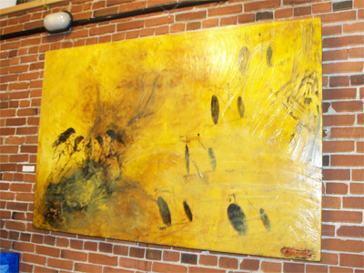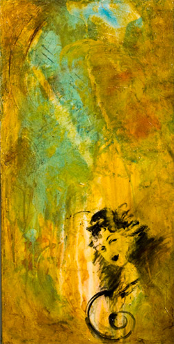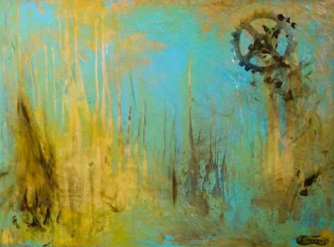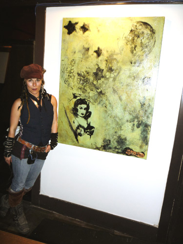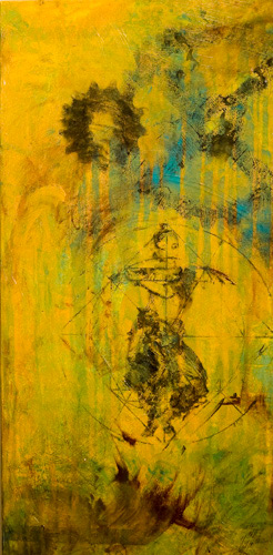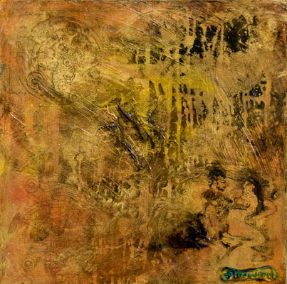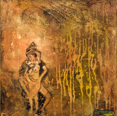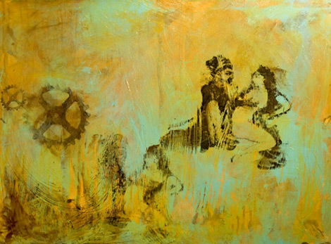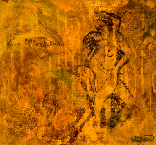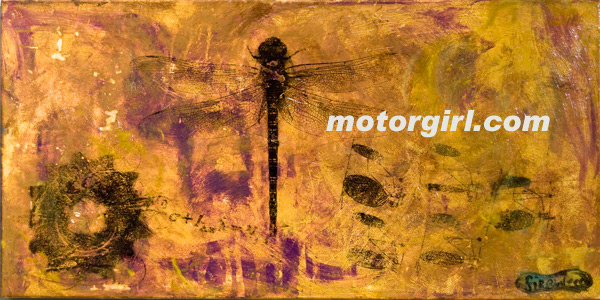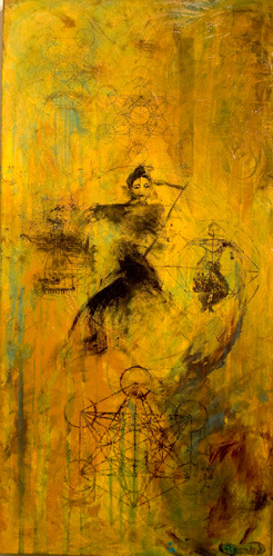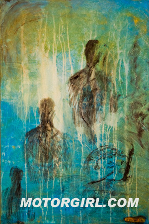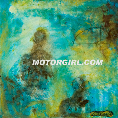 Fireweed is an award winning Emily Carr Graduate, Mother and Motorcyclist. Crossing the mediums with photography, film, video, 2-D art and even fire performance – for her next show she explores the themes of modern technology and ancient rites. Her passion for riding motorcycles and for the ancient near east and Indian culture have brought her to the top of the Himalayas on small dirt bikes and into the archives of Eastern European engineering/scientific museums discovering that science and old mythology have links – you just have to look between the lines. With each stroke and each layer, sometimes taking as many as three months to finish twenty layers of paint on each work she pushes the boundaries of fabricated and body mechanics in humanity and machine. Ascetics and meditation can be found motorcycling with full awareness on a mountain highway or it can be as simple as reaching for a loved one with a kiss, holding your child in your arms or examining the internal mechanics of a 1520 cc motorcycle engine scattered across a cement floor. Focusing her energy on the texture and the meditation of getting to a place of deep layering with symbols carried throughout: an old poem, an ancient plaque from a Buddhist stupa in Katmandu, blueprints from one of her favorite motorcycle parts, sculpture from a tantric temple in Northern India, a detail from a dragonfly’s wing, scientific formulas of “counter-steering” and other physics formulas that have become part of our day to day lives and mean something to her or her loved ones – the paintings combine two very different facets of life in a sensual way. This fusion of science and sensuality both holding a mysterious spell over the viewer to try to find more, to meditate more, to breathe more, to look deeper, to touch your loved one more…to find peace and love in this industrial place we call the City.