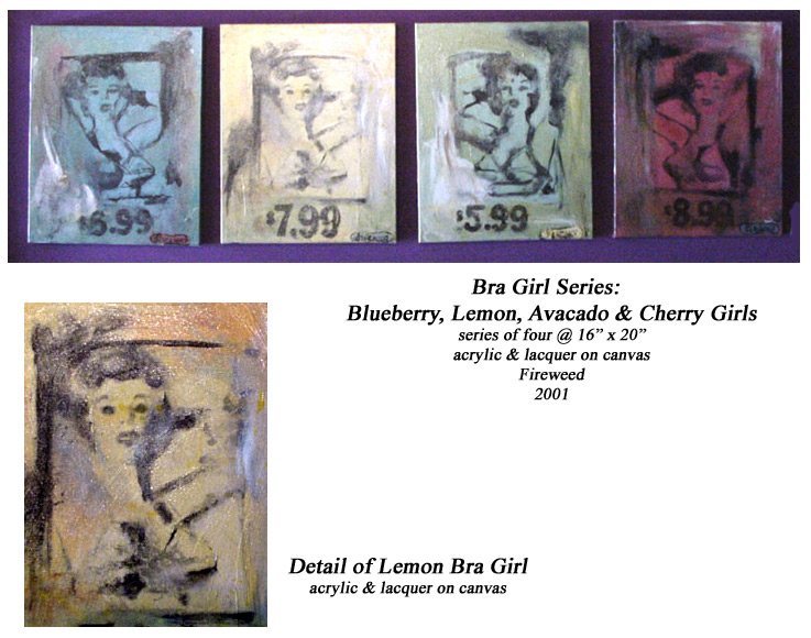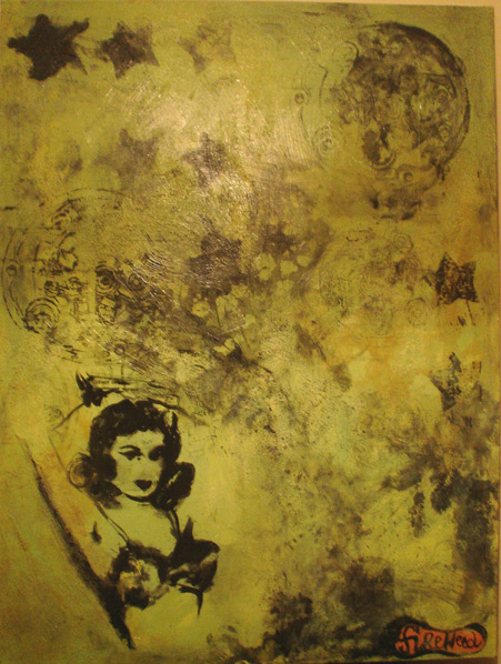 This show is different from my last one Ride Hard Wear a Bra. I took similar themes: motorcycles, sassy pin-up girls and motorcycle parts, but used a different technique. The last series had more of a pulp fiction feel. Large flat layers of paint very graphic and dramatic but missing the expression of a paint brush. The paintings were large and full of witty juxtapositions Ride Hard Sell Tupperware, Ride Hard Eat Spam. The results were successful but I was missing, well, painting! The get down and dirty, messing with mediums, destroying & reconstructing¦my sassy fifties style work was great for pin-up girl magazines but I wanted to paint again!