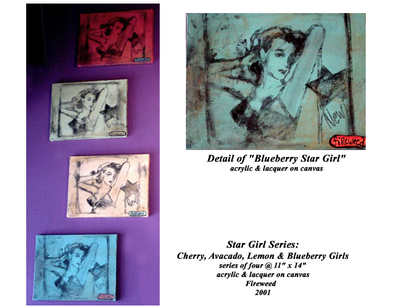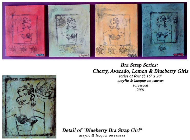 I love repetition and simplicity in color. The palette of the 50's and 60's reflect the era from which I took my girls - carnelian reds, mustard yellows, avocado greens and robin's egg blues. The women from this era (to me) were the epitome of sensuality. Not implanted or surgically altered. They were the real thing with a real woman's body. The curves, the innocence of a provocative glance, the fetish-like brassieres; it was all about voluptuousness. I looked through old lingerie catalogues and discovered the women that you see in front of you. I mixed and matched taking a head from one, the bust of another, the gaze from somewhere else and created Bombshell, Flower Girl, Bra Girl and Star Girl.
