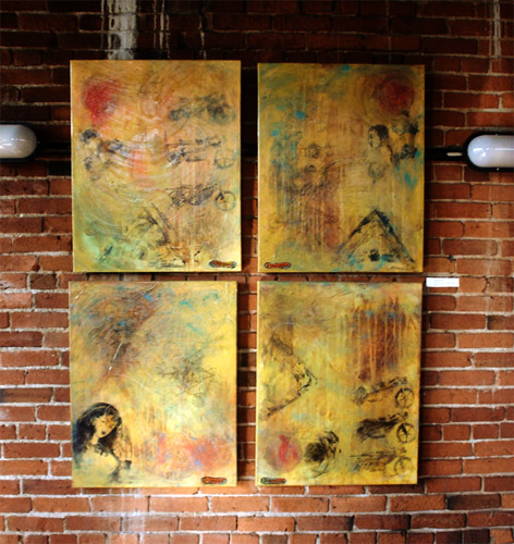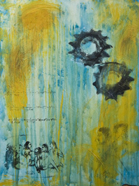 Fireweed is an award winning Emily Carr Graduate, Mother and Motorcyclist. Crossing the mediums with photography, film, video, 2-D art and even fire performance – for her next show she explores the themes of modern technology and ancient rites. Her passion for riding motorcycles and for the ancient near east and Indian culture have brought her to the top of the Himalayas on small dirt bikes and into the archives of Eastern European engineering/scientific museums discovering that science and old mythology have links – you just have to look between the lines. With each stroke and each layer, sometimes taking as many as three months to finish twenty layers of paint on each work she pushes the boundaries of fabricated and body mechanics in humanity and machine. Ascetics and meditation can be found motorcycling with full awareness on a mountain highway or it can be as simple as reaching for a loved one with a kiss, holding your child in your arms or examining the internal mechanics of a 1520 cc motorcycle engine scattered across a cement floor. Focusing her energy on the texture and the meditation of getting to a place of deep layering with symbols carried throughout: an old poem, an ancient plaque from a Buddhist stupa in Katmandu, blueprints from one of her favorite motorcycle parts, sculpture from a tantric temple in Northern India, a detail from a dragonfly’s wing, scientific formulas of “counter-steering” and other physics formulas that have become part of our day to day lives and mean something to her or her loved ones – the paintings combine two very different facets of life in a sensual way. This fusion of science and sensuality both holding a mysterious spell over the viewer to try to find more, to meditate more, to breathe more, to look deeper, to touch your loved one more…to find peace and love in this industrial place we call the City. |